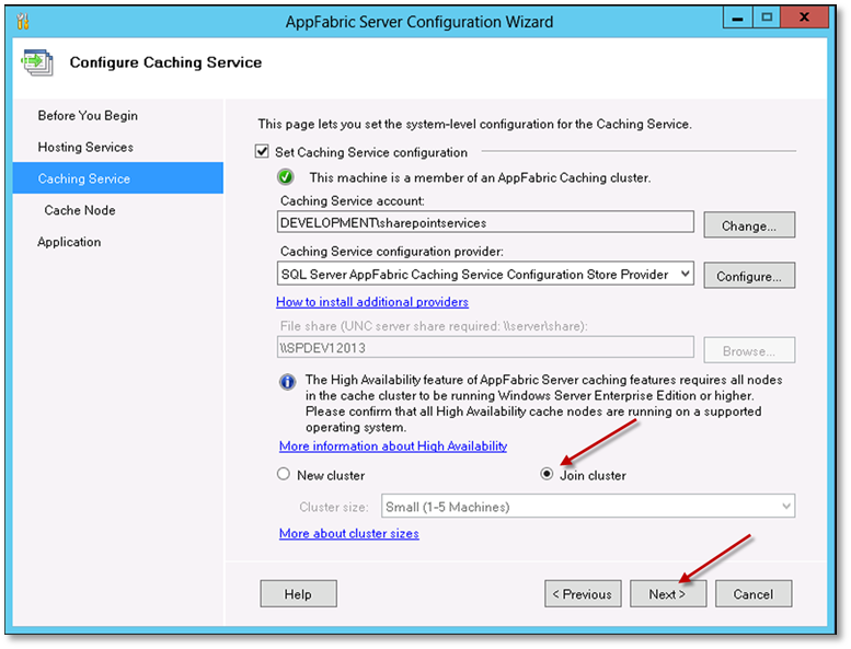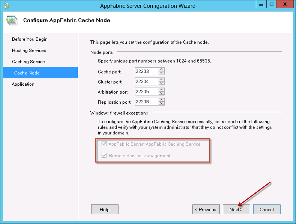 11. On the Configure AppFabric Cache Node page, if you have Windows Firewall enabled, select both checkboxes: