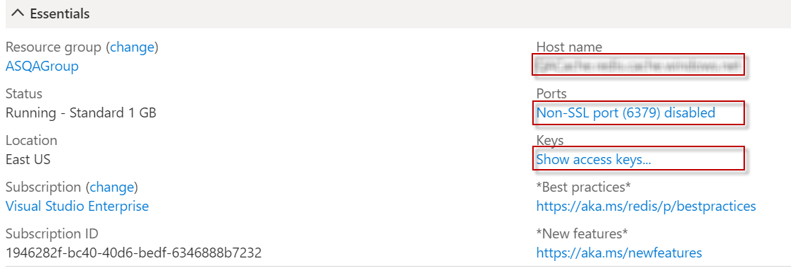 • Endpoint: The Host name is the Azure cache endpoint. Select and copy the value.