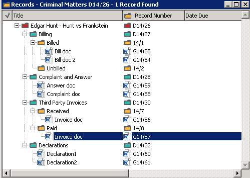 Using the automatic sub folder feature, you can set up Content Manager to create an entire folder hierarchy when a user creates a new matter record. This hierarchy could contain all the folders needed for the matter in Content Manager.