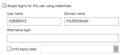In the Network Login tab of the Location’s Properties, to enable a Location to accept logins, check the option to Accept logins for this user using credentials. Enter the domain account details (User name and Domain Name).