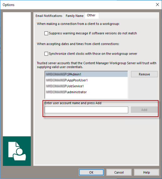Logged into the Content Manager Enterprise Studio as a system administrator. Select the Dataset used for SharePoint and Content Manager integration. Go to, Home > General > Options. The Options window is displayed. Click Other tab.