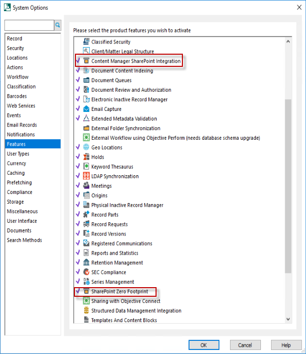 Enable the Content Manager SharePoint Integration and SarePoint Zero Footprint features.