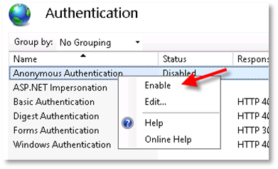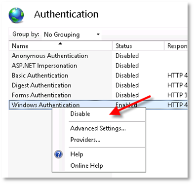 Authentication will initially show Anonymous Authentication as Disabled and Windows Authentication as Enabled.