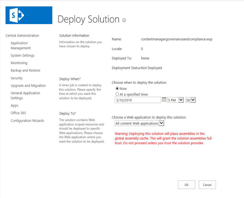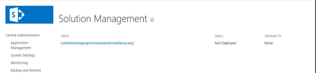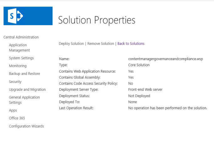 Locate and click contentmanagergovernanceandcompliance.wsp solution in the list of solutions displayed in Solution Management page. The Solution Properties page is displayed.