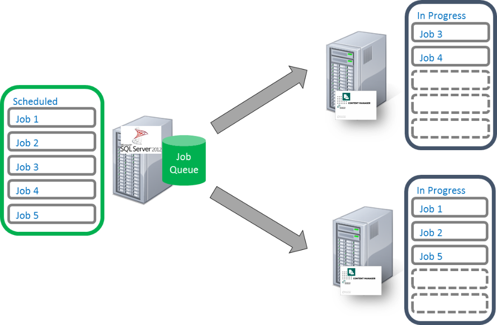 Each server runs the Content Manager SharePoint Service, as a local Windows service. This is responsible for coordinating the job queue. The number of jobs that a server can run concurrently is based on the value entered in the configuration tool for the server’s Maximum job count property. If a server is not currently processing its maximum number of jobs, it will take jobs from the job queue to process.