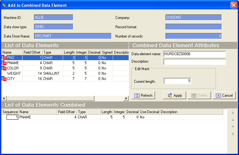 The Add to Combined Data Element window displays information about the combined data element you are managing and the data store layout data element that comprise the combination. This window lets you display, modify, or delete data element combination information.