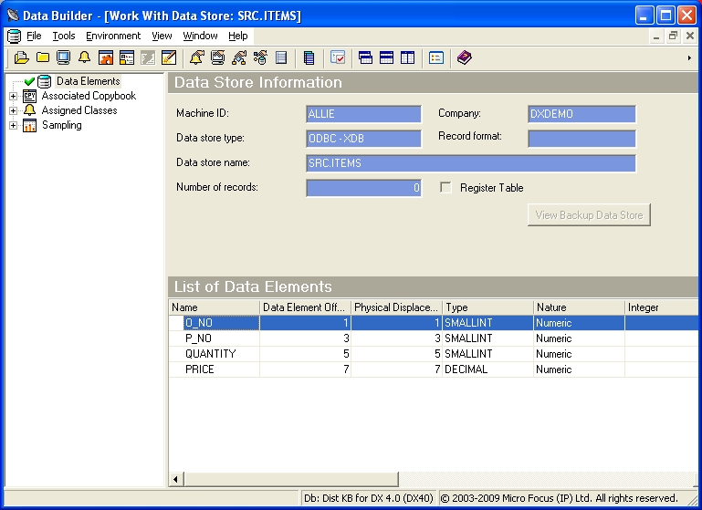The left pane contains a tree structure containing nodes with the available information about the opened data store. The right-hand part of the screen shows a list of data linked to the selected node.