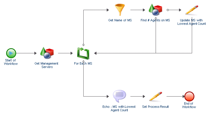 If you install the AppManager Integration Adapter (AppManager adapter), you can design a workflow to determine which management server (MS) in your AppManager environment to use when deploying the next AppManager agent. Each AppManager agent in the environment has a primary MS and an optional secondary MS. Ideally, each MS handles a similar workload with a similar number of agents.