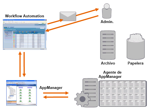 En este ejemplo, AppManager detecta que el espacio disponible en el disco ha descendido por debajo del umbral y genera un evento, que desencadena un proceso en Workflow Automation y crea un elemento de trabajo (una instancia de un proceso en ejecución). Workflow Automation solicita un análisis del uso del disco a AppManager, identificando los N principales causantes por carpeta, tipo de archivo y antigüedad, prestando especial atención a las áreas de almacenamiento de archivos temporales conocidos. Workflow Automation envía un mensaje de correo electrónico con los resultados del análisis al usuario correspondiente, solicitando aprobación para realizar una limpieza del disco. Este mensaje incluye un enlace a la Operations Console. El usuario entra a la Operations Console y aprueba la limpieza parcial. Workflow Automation ordena a AppManager que elimine los archivos aprobados y analice el nuevo estado del espacio en disco. Workflow Automation espera la confirmación de que la acción se ha realizado correctamente y envía esta información al usuario. Workflow Automation cierra el elemento de trabajo.