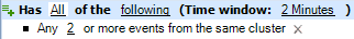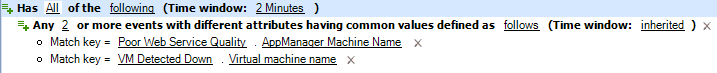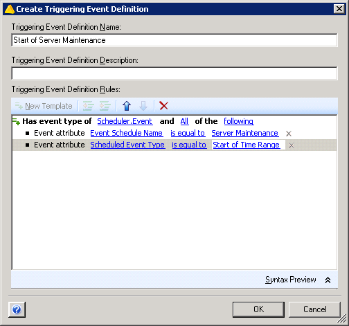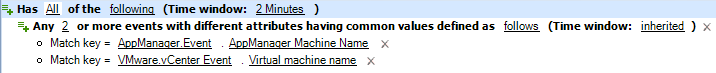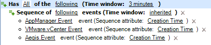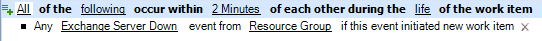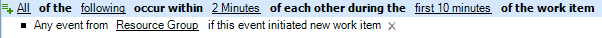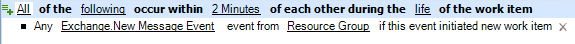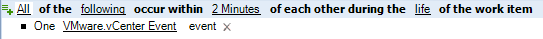 デフォルトのトリガでは、1つのイベントが指定したすべてのトリガ式に適合する必要はありません。トリガの要件は、「1つまたは複数」のイベントが「指定した期間内」に指定したすべての式に適合することのみです。一部のトリガ式に名前付きイベントを使用して、ある特定のイベントがすべての条件に適合したときにWorkflow Automationが作業項目を開始するようにすることができます。トリガ式の詳細については、トリガ式についてを参照してください。