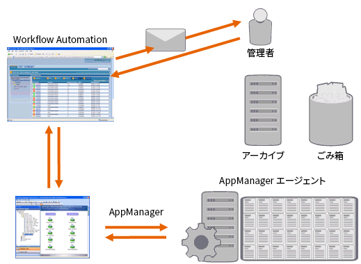 この例では、ディスクの空き容量がしきい値を下回っていることがAppManagerによって検出され、イベントが生成されます。そのイベントによってWorkflow Automationのプロセスがトリガされ、作業項目(実行プロセスのインスタンス)が作成されます。Workflow AutomationからAppManagerのディスク使用量分析が要求され、既知の一時ファイルストレージ領域が重点的に確認され、上位N位の問題のデータがフォルダ、ファイルの種類、日付ごとに特定されます。その分析結果はWorkflow Automationから適切なユーザに電子メールで送信されます。そのメールは、ディスクのクリーンアップに同意するように求めるものです。また、Operations Consoleへのリンクも記載されます。ユーザーはオペレーションコンソールにログオンし、部分的なクリーンアップを承認します。Workflow AutomationはAppManagerに対して、承認されたファイルを削除し、新しいディスク容量の状況を分析するように命令します。Workflow Automationは処理の成功が確認されたら、その結果がユーザに送信されます。Workflow Automationは作業項目を閉じます。