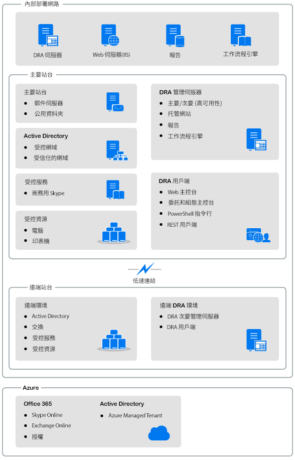 Azure 和內部部署 Active Directory、Exchange 及商務用 Skype 的支援: 可讓管理員管理 Azure 和內部部署 Active Directory、內部部署 Exchange Server、內部部署商務用 Skype、Exchange Online 和商務用 Skype Online。