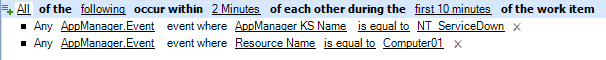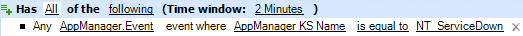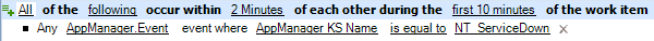 Nto2and create a named event calledNT_ServiceDown, where the event type isAppManager.Eventand the value for the AppManager KS Name attribute isNT_ServiceDown, the trigger initiates a work item when at least two events with the specified values arrive within the specified time window.