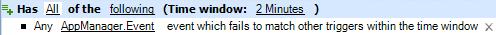 AppManager.Event, the trigger initiates a work item when it matches any AppManager event that does match another trigger within the specified time window.