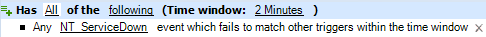 NT_ServiceDown, where the event type isAppManager.Eventand the value for the AppManager KS Name attribute isNT_ServiceDown, the trigger initiates a work item only if an event with the specified values does not match any other trigger within the specified time window.