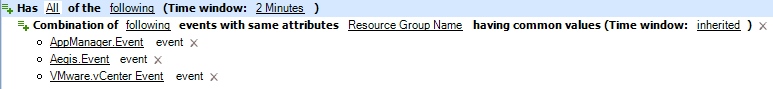 If you use base events, the trigger compares only the specified attributes. For example, the following configuration compares the Resource Group Name attribute on an AppManager event, an Aegis event, and a vCenter event. The trigger ignores all other attributes and values.