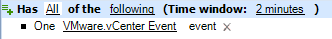 If you use base events, the trigger compares only the specified attributes. For example, the following configuration compares the AppManager Machine Name attribute on an AppManager event to the Virtual Machine Name attribute on a vCenter event. The trigger ignores all other attributes and values.