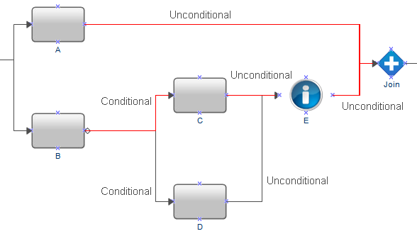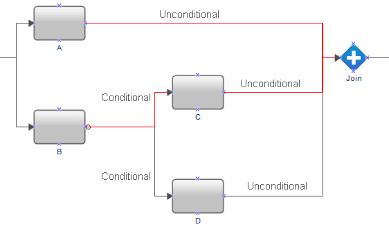 The workflow always traverses the unconditional connector between A and the Join activity, but the conditional connectors after B require the workflow to executing either C or D. If the workflow cannot traverse the connector between D and the Join activity, the Join activity cannot proceed.