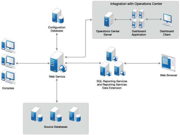 The Reporting Center Console connects to the Reporting Center Web Service, which allows you to perform queries on the source databases. You can install the Console on multiple computers. The Web Service retrieves data from the source databases and returns it to the Console, where you can configure and run reports. The Reporting Services Data Extension makes the same connection to the Web Service to publish, print, and provide Web access to reports using SSRS. You can deploy reports to multiple instances of SSRS and then view the reports in a Web browser. Reporting Center stores report configuration, security, and deployment information in the Reporting Center Configuration Database.