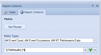 If you want to filter a metric without the string AMHealth, you need to specify the filter as ^((?!AMHealth).)*$ and select the Regular Expression check box.
