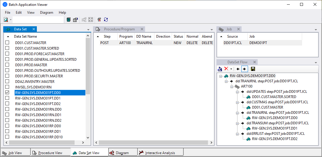 The Batch Application Viewer window displays job, procedure, and data set views of the batch application. Your selection in the current view, displayed in the lefthand pane, filters the objects displayed in the other two views. Click the appropriate tab at the bottom of the window to make a view current. To generate a report for the current view in HTML, choose File > Report.