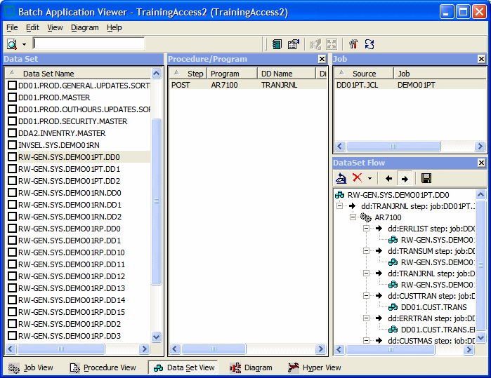 The Batch Application Viewer window displays job, procedure, and data set views of the batch application. Your selection in the current view, displayed in the lefthand pane, filters the objects displayed in the other two views. Click the appropriate tab at the bottom of the window to make a view current. To generate a report for the current view in HTML, choose File > Report.