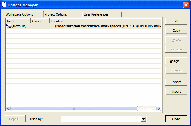 The figure below shows the Options Manager window at startup, with the tab for the Workspace Options grouping selected. For