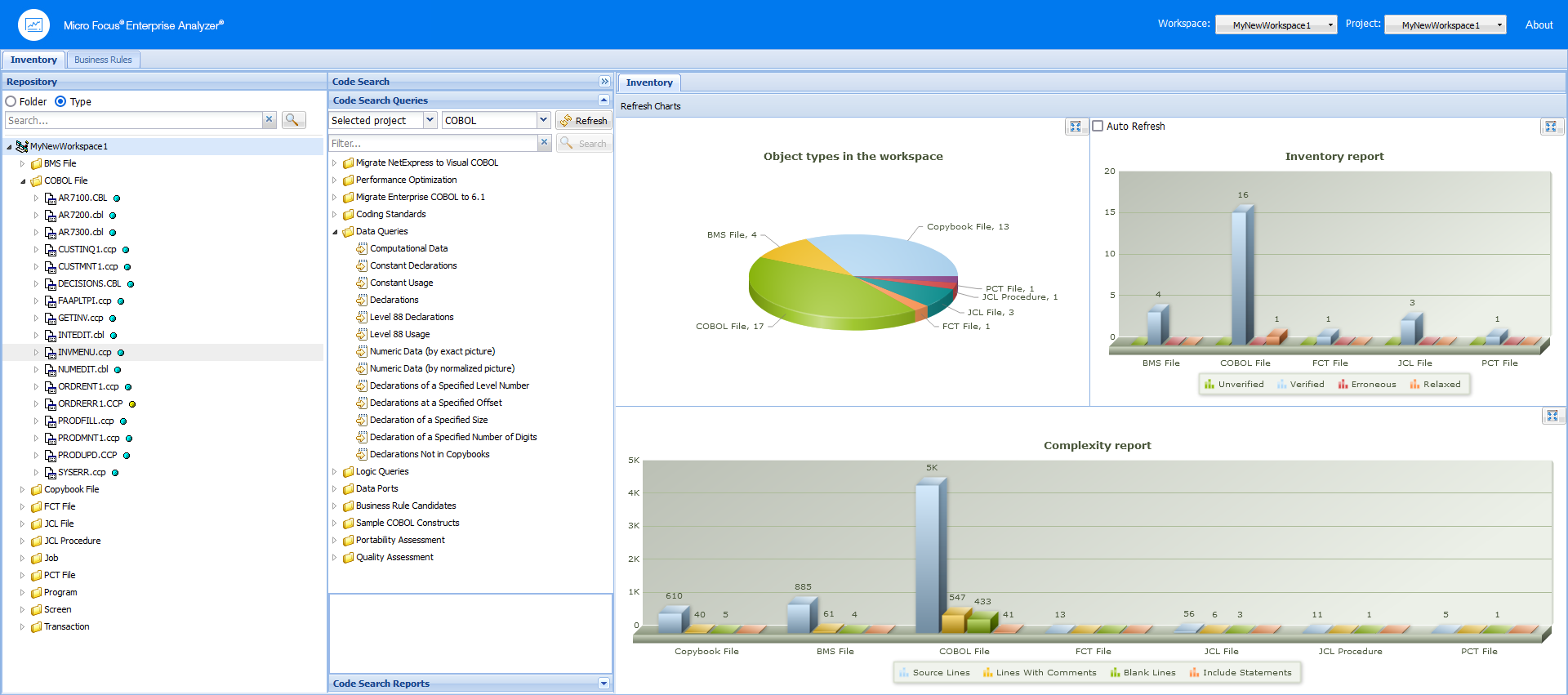 In this pane you have two different views Code Search Queries and Code Search Reports. From Code Search Queries you can execute queries defined in Code Search in EA and from Code Search Reports you can execute pre-defined reports such as Quality Assessment, Performance Optimization, Portability Assessment, and various migration reports.