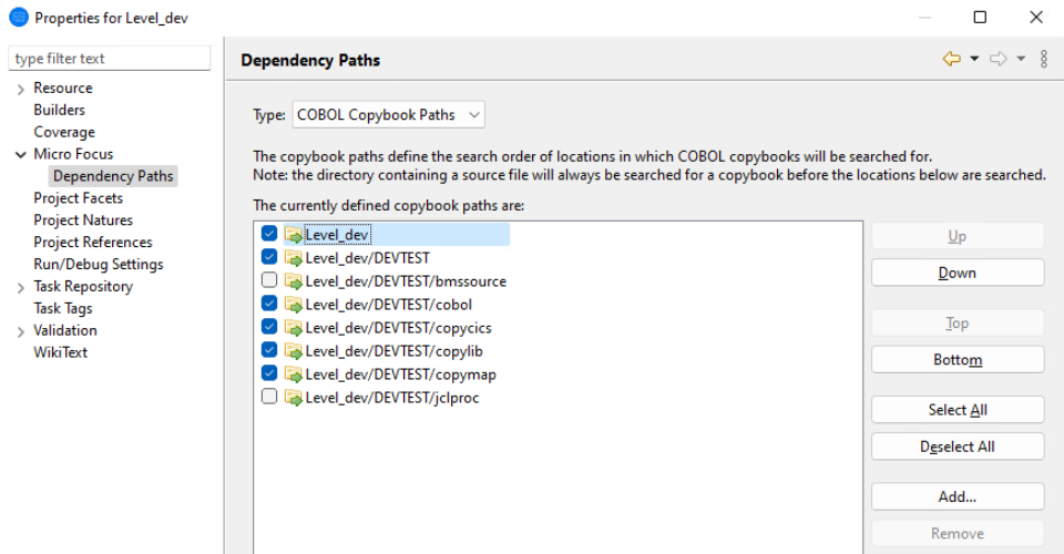 The following is an example of how you can set workgroup levels Enterprise Developer. There are numerous other ways in which the projects can be configured to work in this type of system. You can add a larger number of additional directories to each copybook project (either as relative paths to the workspace variable or as variables in their own right) which would allow for even more configurability.