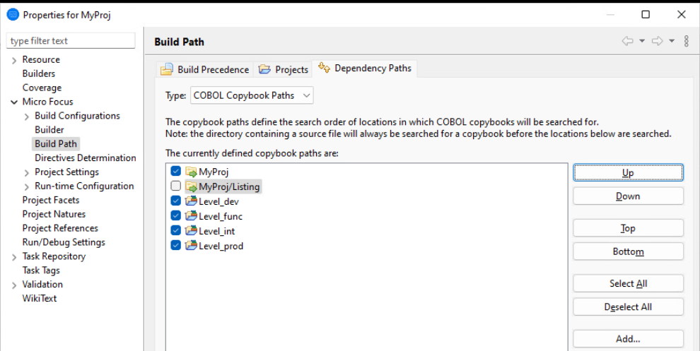 As you can add multiple paths to each copybook project, each one of these projects can then represent a "level" in the workgroup hierarchy. Multiple copybook projects can then be used to represent the set of levels in a potential workgrouping environment. There are many ways in which the final organisation can be arranged; the important thing is that the IDE 'knows' about the files to be used for compilation.