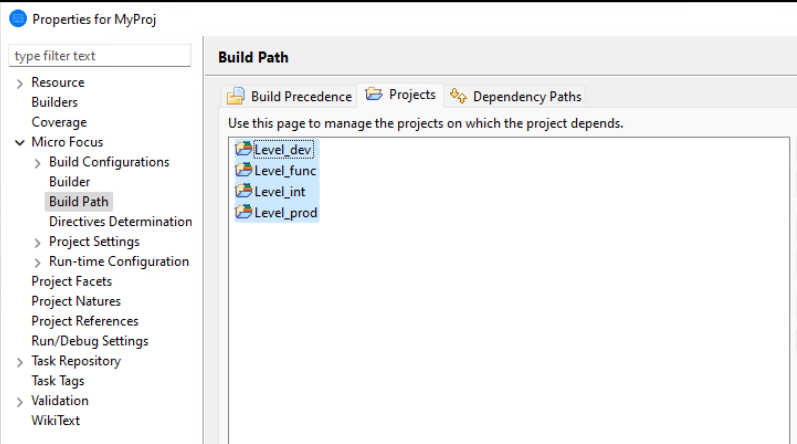 This enables you to select the projects on which this one depends. The following example shows four levels have been added: