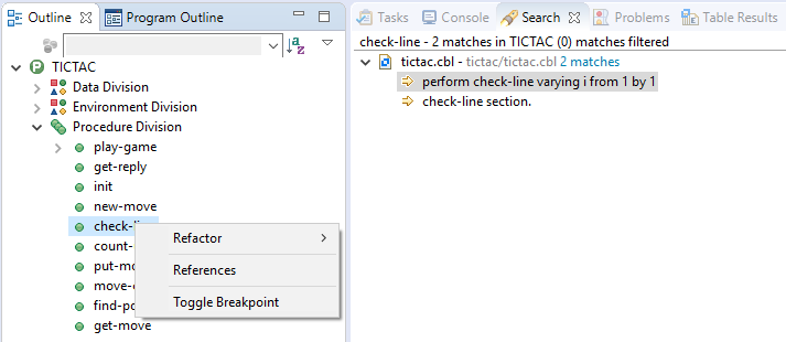 • The Outline view shows the structure of the file you are editing. This view enables you to navigate around the file. For example, if you want to go to a particular COBOL section or a data item in the Editor view, just click on it in the Outline view.