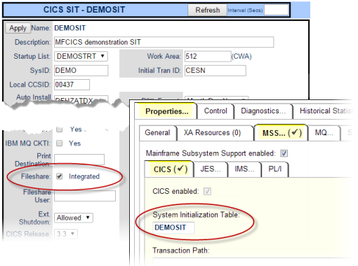 • Enable the Fileshare Integrated option in your chosen SIT, then specify the SIT in the CICS tab in the Mainframe Subsystem Support section.