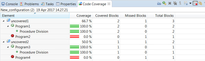 To view the covered and missed blocks, either scroll down the code of a COBOL program or double-click the lines of the program's structure in the Code Coverage view: