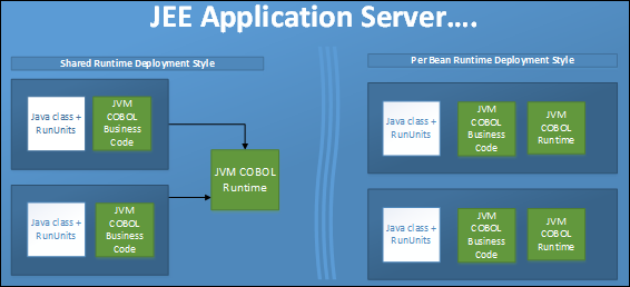 When choosing how to deploy the JVM COBOL run-time system that is required by JVM application code, consider the deployment options illustrated in this diagram: