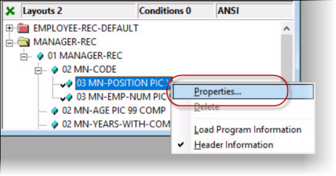 The datavseq.dat data file contains three types of record: employee, manager, and executive. You need to create a layout for each type of record, and then set criteria for when a particular layout is used. Of the three layouts, you define one as the default; all others are defined as conditional.