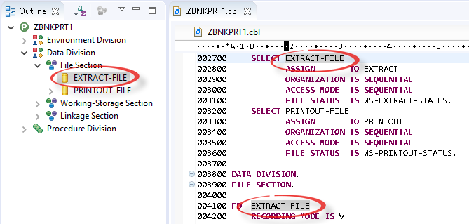 for example, click an item in the Data Division section to jump to that item in the editor.