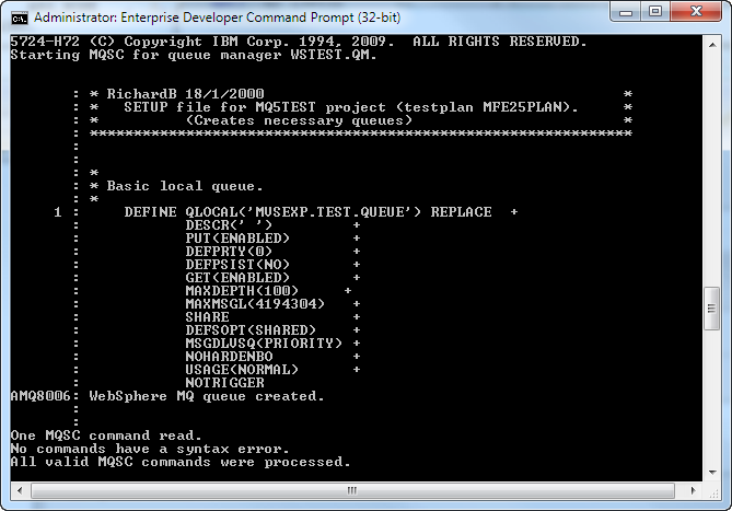 4. To create the test queue, type crtmqm WSTEST.QM and press Enter.