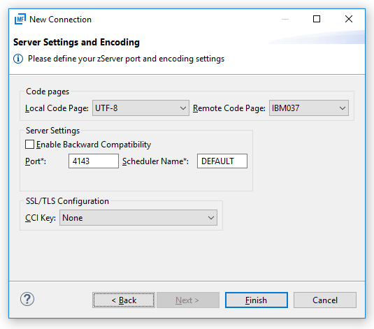 11. Only check the Enable Backward Compatibility check box if you want to connect to a z/Server prior to 2.3 Update 1.