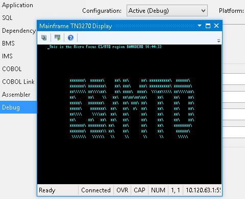 Visual Studio enters debug mode with a few new windows open in the IDE. The embedded Rumba display starts as well - if it is not started, click the mainframe TN3270 display icon, , on the debug tool bar, or click Debug > Windows > Mainframe TN3270 Display. This opens the embedded Rumba display and automatically connects the session to the enterprise server.