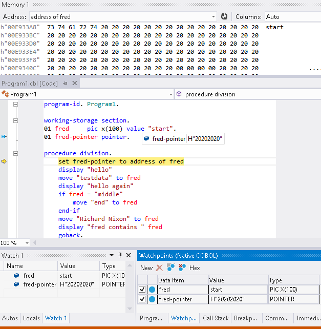 Visual Studio enters debug mode and stops on the line for display "hello". This is because you set watchpoints for the two variables in the program and the value of one of them, fred-pointer, has changed. The debugger breaks the execution and stops on the first line after the one on which the value of the data item changed.
