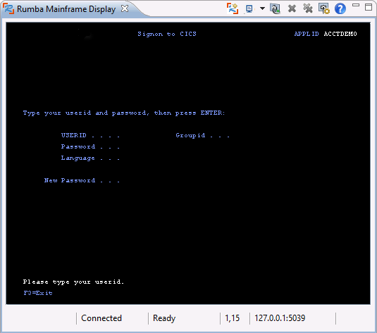 The Rumba Mainframe Display view is a TN3270 Mainframe Rumba emulator embedded in the IDE. To detach and leave the view floating, right-click the toolbar of the view, and click Detached. The IDE preserves the last state, size, and position of the window between debug sessions.
