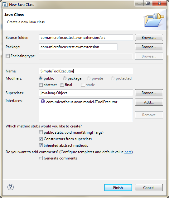 This opens a template Java class for the tool. You need to define the Java class to implement the tool.