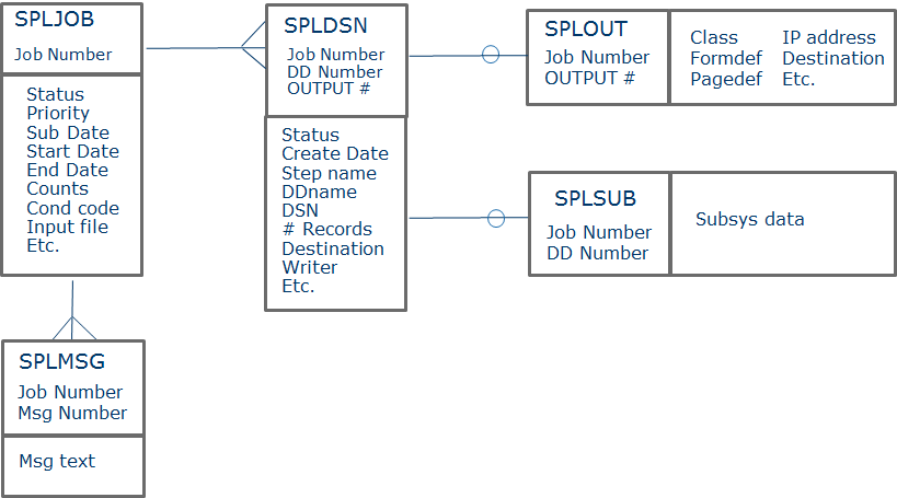| SPLSUB | Single record per Job SUBSYS clause, keyed on Job number and SYSOUT DD number. (The SYSOUT DD number equates to the Dnnnnn number from the spool dataset DSN.) |
