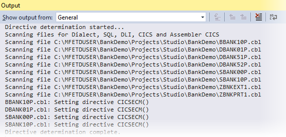 Previously, you ensured the IDE is configured to scan the COBOL files you add into the project and set directives for dialect, EXEC CICS and SQL. When the files are being imported in the project, the IDE scans them for CICS and SQL settings. You can see that the Output window shows some messages about scanning the files. At the end of scanning, the IDE shows a Preview Changes - Directive Determination offering to set any missing directives as required. Review the directives and click Apply.