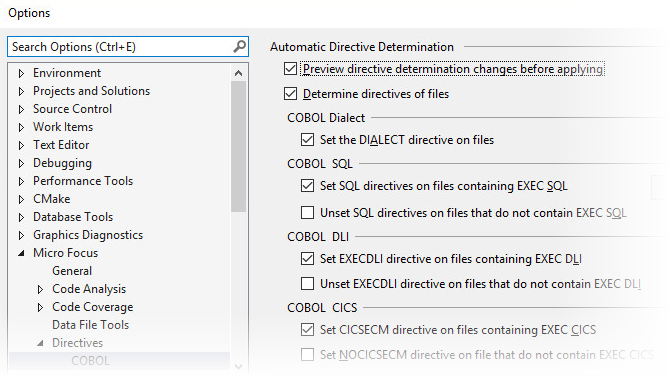 This page enables you to configure what directives are set on the COBOL files that you add to your project. The directives scanning determines the dialect, what EXEC CICS and EXEC SQL statements are used in the COBOL source files and sets directives as detailed on this page.