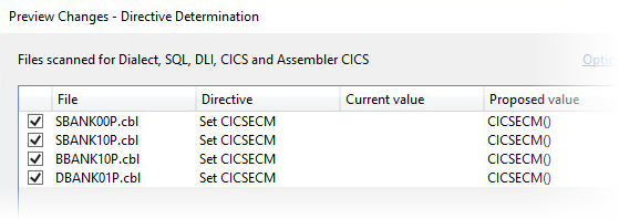 Previously, you ensured the IDE is configured to scan the COBOL files you add into the project and set directives for dialect, EXEC CICS and SQL. When the files are being imported in the project, the IDE scans them for CICS and SQL settings. You can see that the Output window shows some messages about scanning the files. At the end of scanning, the IDE shows a Preview Changes - Directive Determination offering to set any missing directives as required. Review the directives and click Apply.