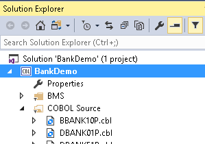 The source files of the demonstration application are stored in subfolders named after the file type (for example, bms, cbl, copybook, jcl) in the C:\MFETDUSER\Bankdemo\Sources directory. The Visual Studio project is in the C:\MFETDUSER\Bankdemo\Projects folder. You will be adding the source files to the Visual Studio project.