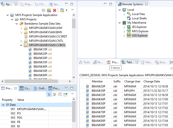 The project's COBOL members are listed in the tree and table view, and if you click a member, its properties are displayed
