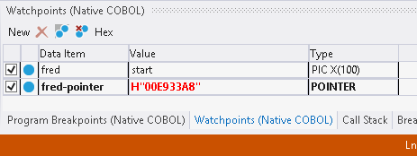 Notice that the Watchpoints window indicates the change by emboldening the data item and highlighting the changed value in red: